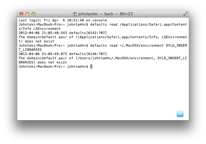 最後,如果系統回應是:「The domain/default pair of (/Users/joe/.MacOSX/environment, DYLD_INSERT_LIBRARIES) does not exist」,那小編就要恭喜閣下,你的 Mac 並沒有感染Flashback 木馬!但如果沒有出現上述情況的話,就請參閱 F-Secure 提供的 Flashback 木馬移除程序了。